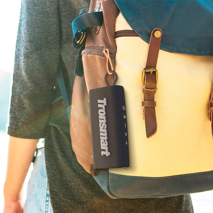 Звоните и принимайте звонки через беспроводную Bluetooth колонку Tronsmart Trip. Здесь стоит чёткий микрофон, который поможет говорить с друзьями. Дважды нажмите кнопку "Включение", активируйте голосового ассистента и говорите без помощи рук