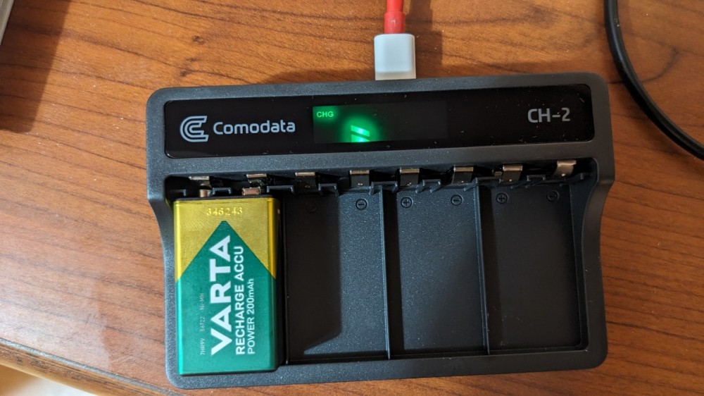 Comodata CH-2 - автоматическое зарядное устройство для 9-вольтовых аккумуляторов типа "Крона". Заряжает до 4-х аккумуляторных батарей одновременно, работает от внешнего разъёма USB, показывает данные процесса на ЖК-дисплее